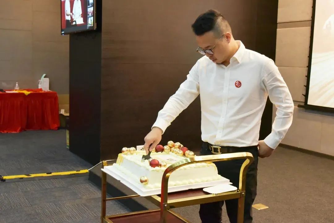 在胡成國的帶領(lǐng)下,各會場同時切開生日蛋糕,共同歡慶德力西生日快樂。